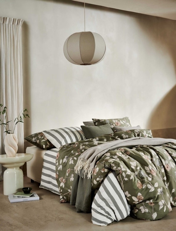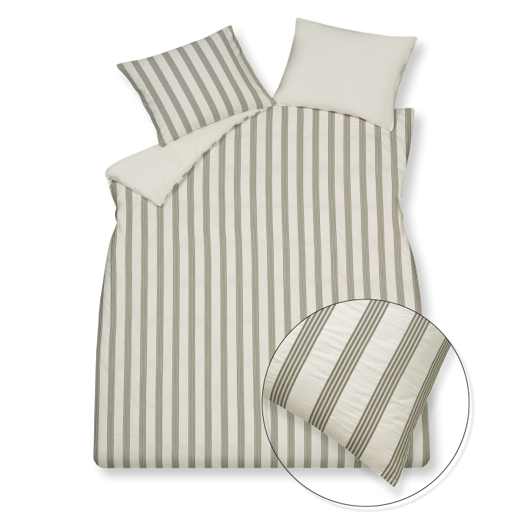 Pure 95 in thyme is een percale dekbedovertrek met geweven groene strepen aan de voorkant en een katoensatijnen offwhite achtergrond. De achterkant is effen. Het dekbedovertrek geeft een luxueuze en comfortabel gevoel.