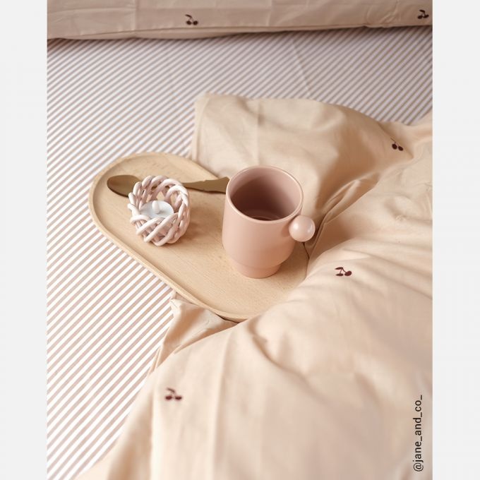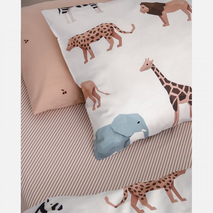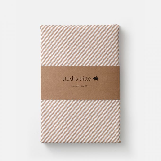 Hoeslaken met smalle diagonale streepjes in de kleur toffee. Het elastiek in de hoeken zorgt ervoor dat de hoes mooi aansluit op het matras. Het hoeslaken is gemaakt van 100% katoen OEKO-TEX gecertificeerd.