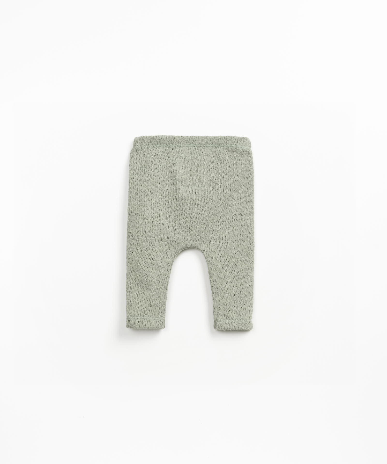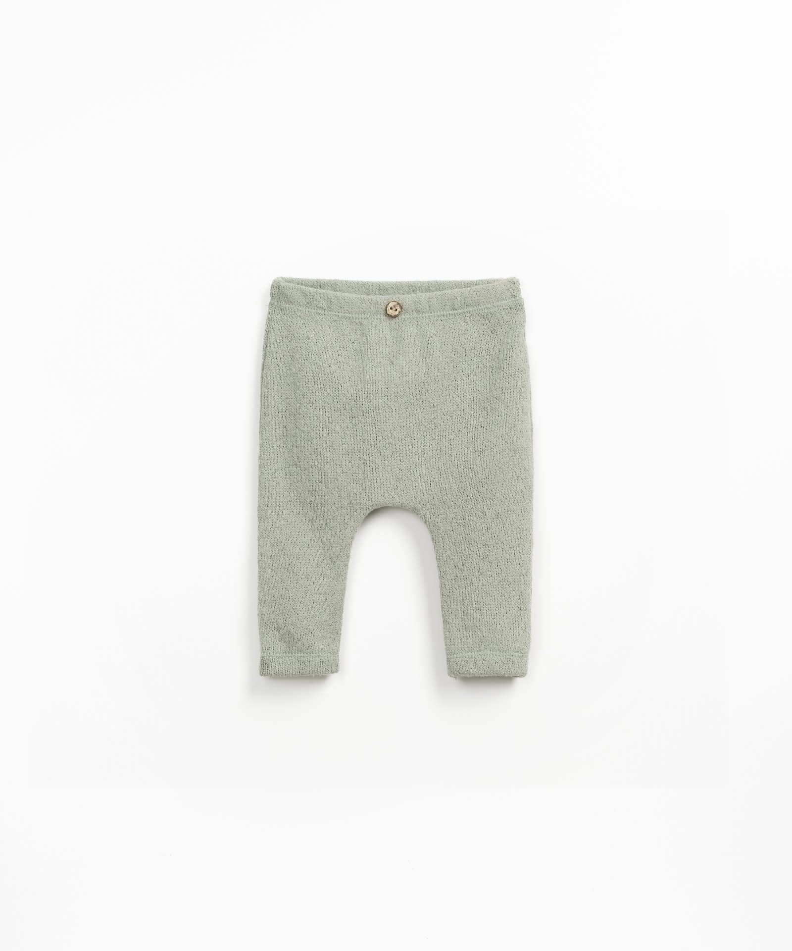 Het mooie fijne broekje jersey leggings heeft een zachte groene kleur, een elastiek in de taille en een houten sierknoopje. Materiaal: 48% katoen, 27% gerecycled polyester, 20% gerecycled katoen en 5% andere materialen.