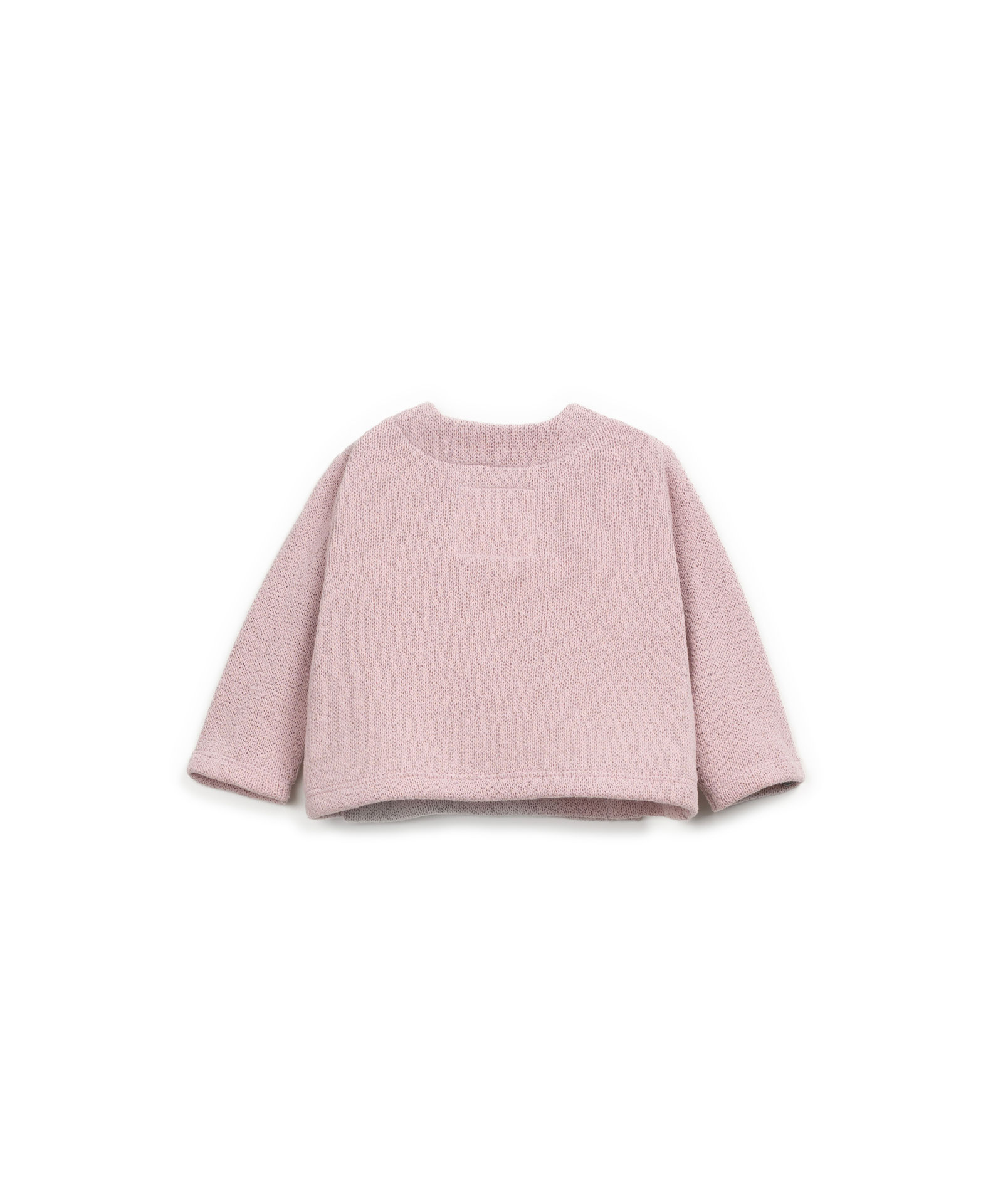 Zacht roze overslagtruitje met houten knoopjes. Aan de binnenzijde zit ook een drukknoopje zodat het vestje mooi blijft zitten. Materiaal: 90% regeneratief katoen en 10% recycled katoen.