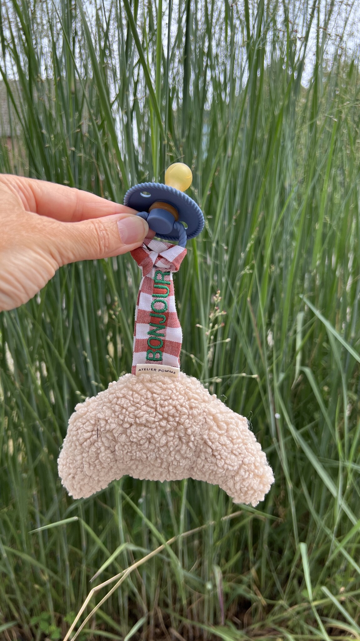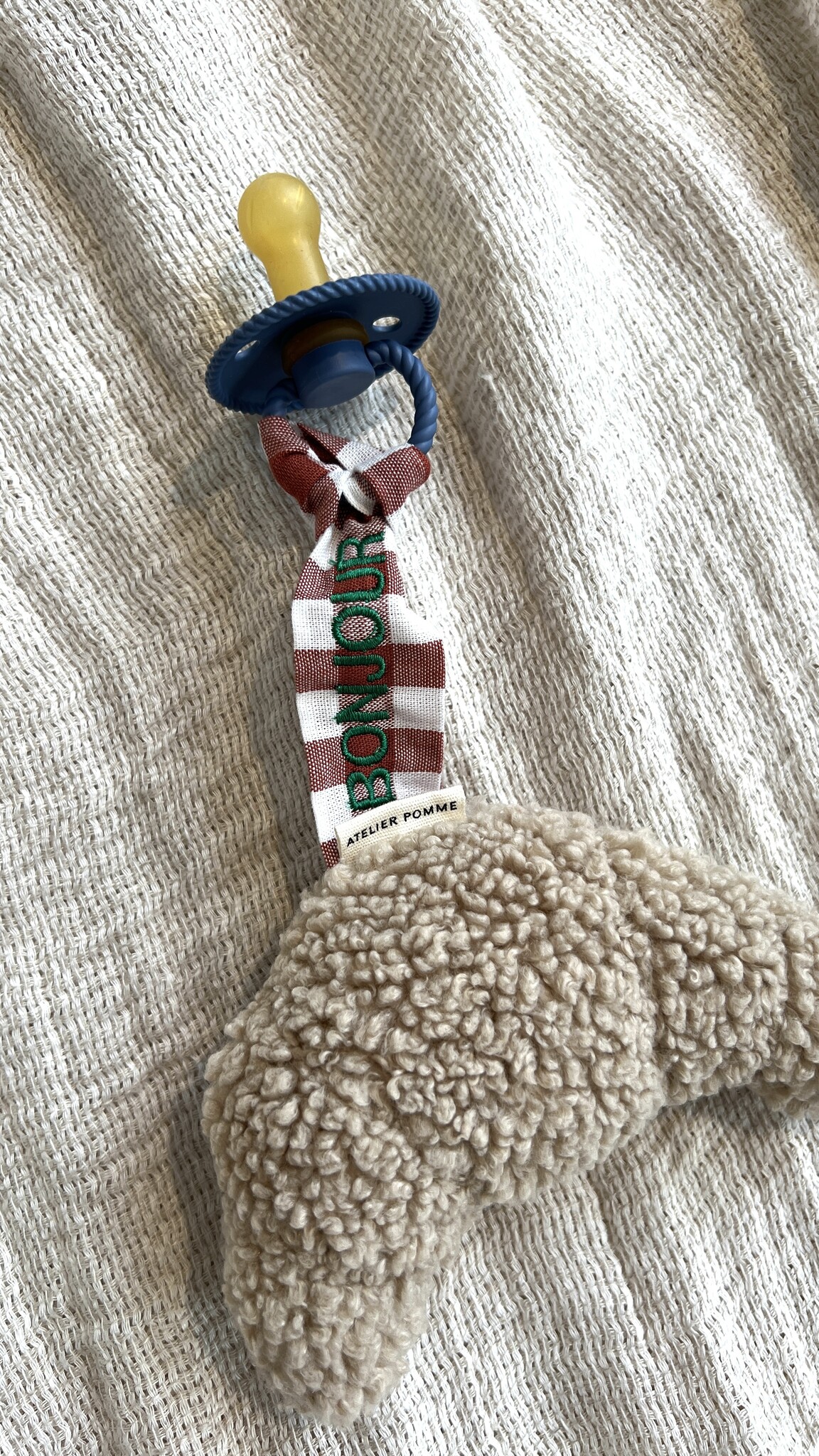 Dit leuke speenkoord is LITTLE CROISSANT, op het koord is met groen garen"BONJOUR" geborduurd! Hallo kleintje! Gemaakt van 100% polyester teddy en een katoenen koord. Wasbaar op 30 graden. 10x7x3cm