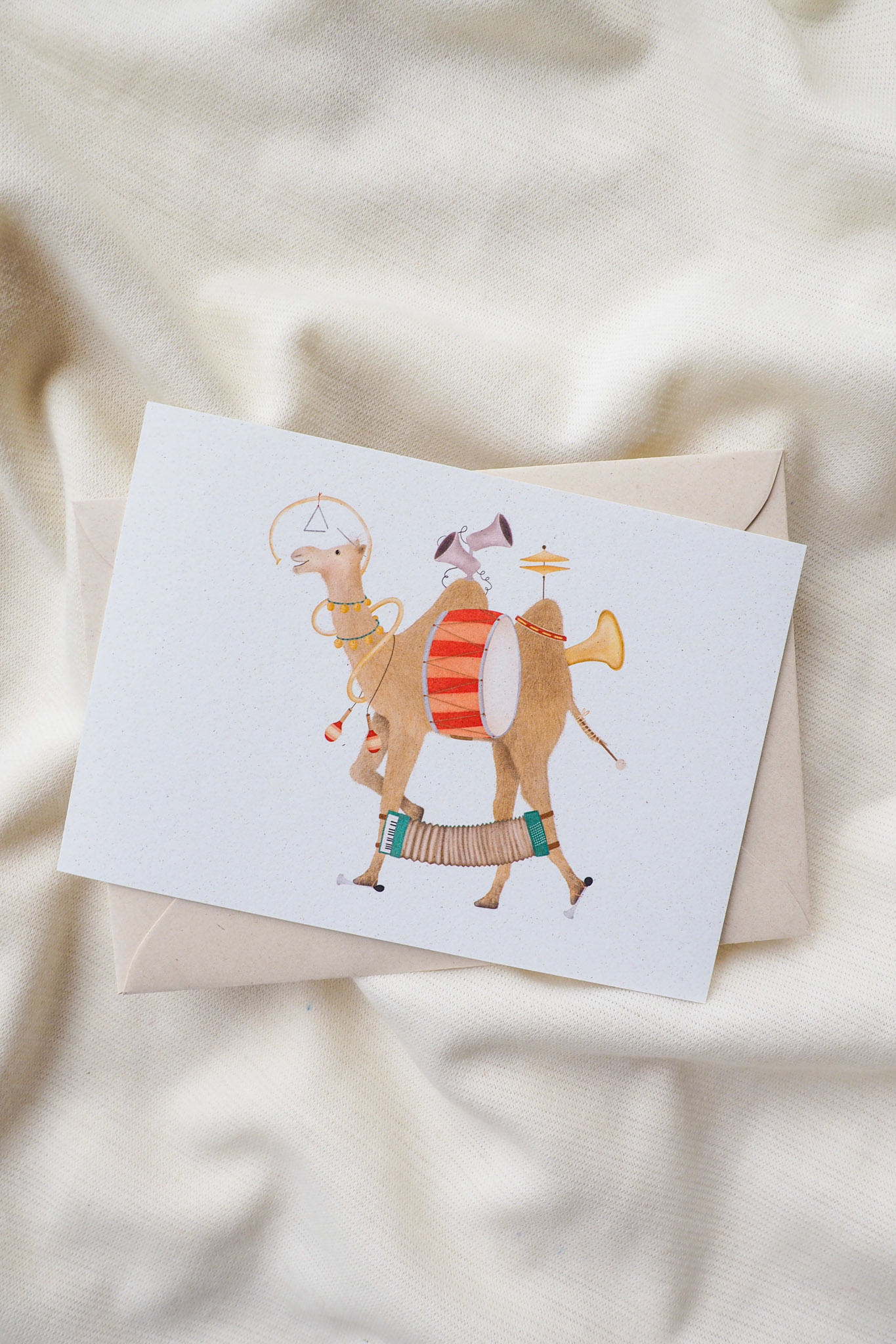 Kaart: Patsss, boem, klets!! One-man camel band A6 formaat. De illustratie is handgemaakt. De kaarten worden geleverd met bijpassende enveloppe, gemaakt van gerecycled papier en tulpenbollen.