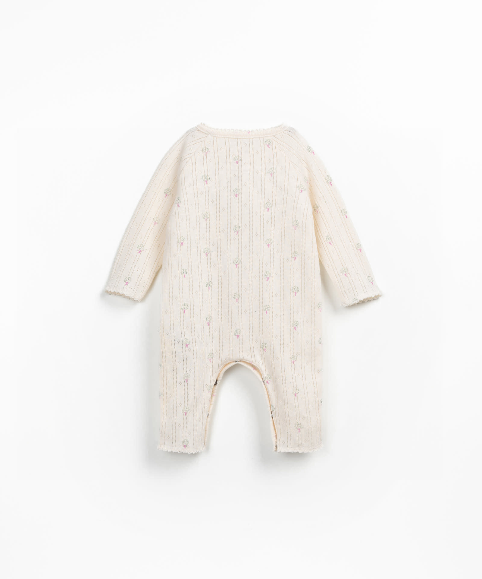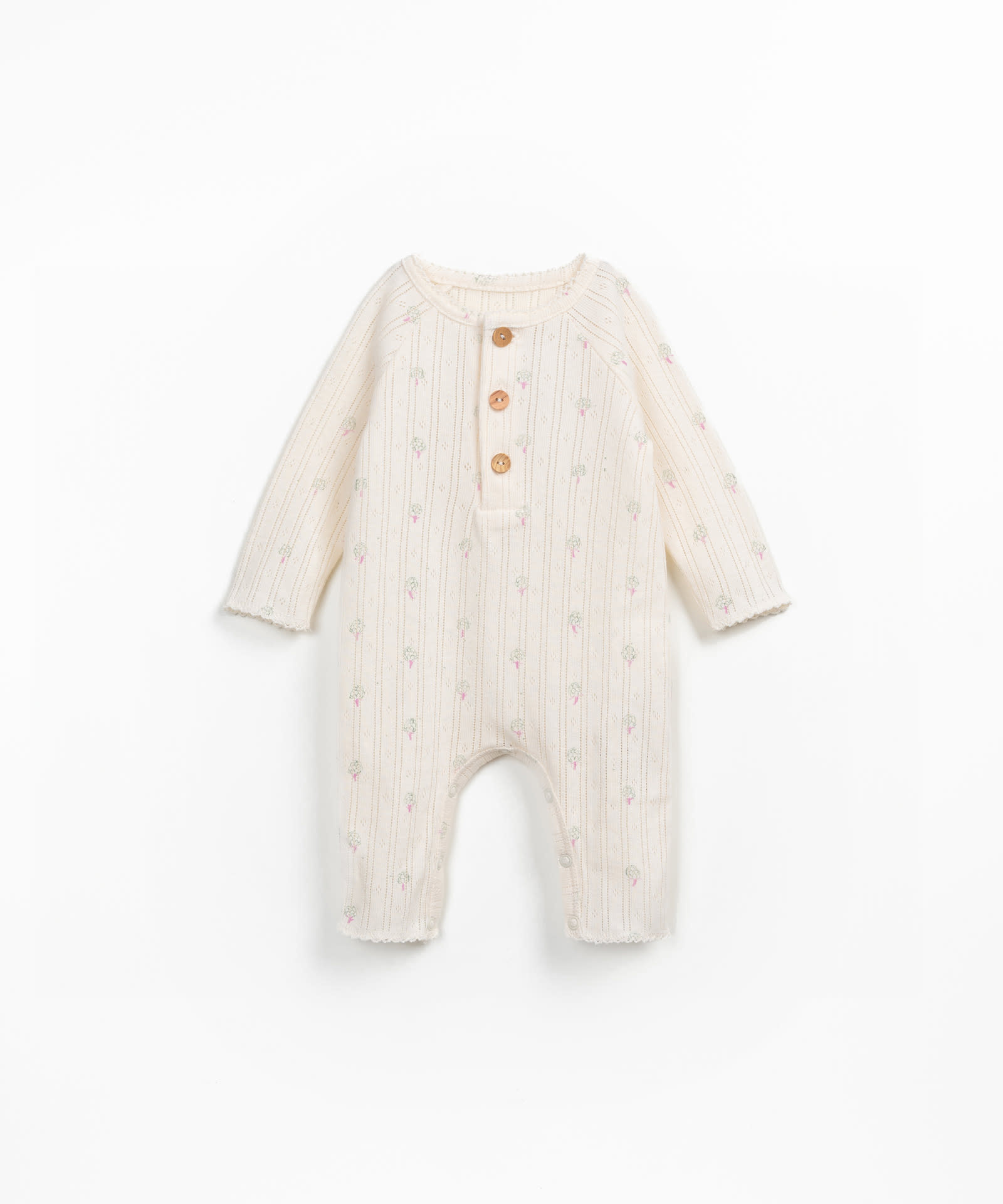 Het schattige printed ajour jumpsuit heeft drie houten knoopjes aan de voorzijde voor het makkelijk aan en uittrekken en drukknoopjes bij de beentjes. Materiaal: 50% organisch katoen en 50% recycled katoen.