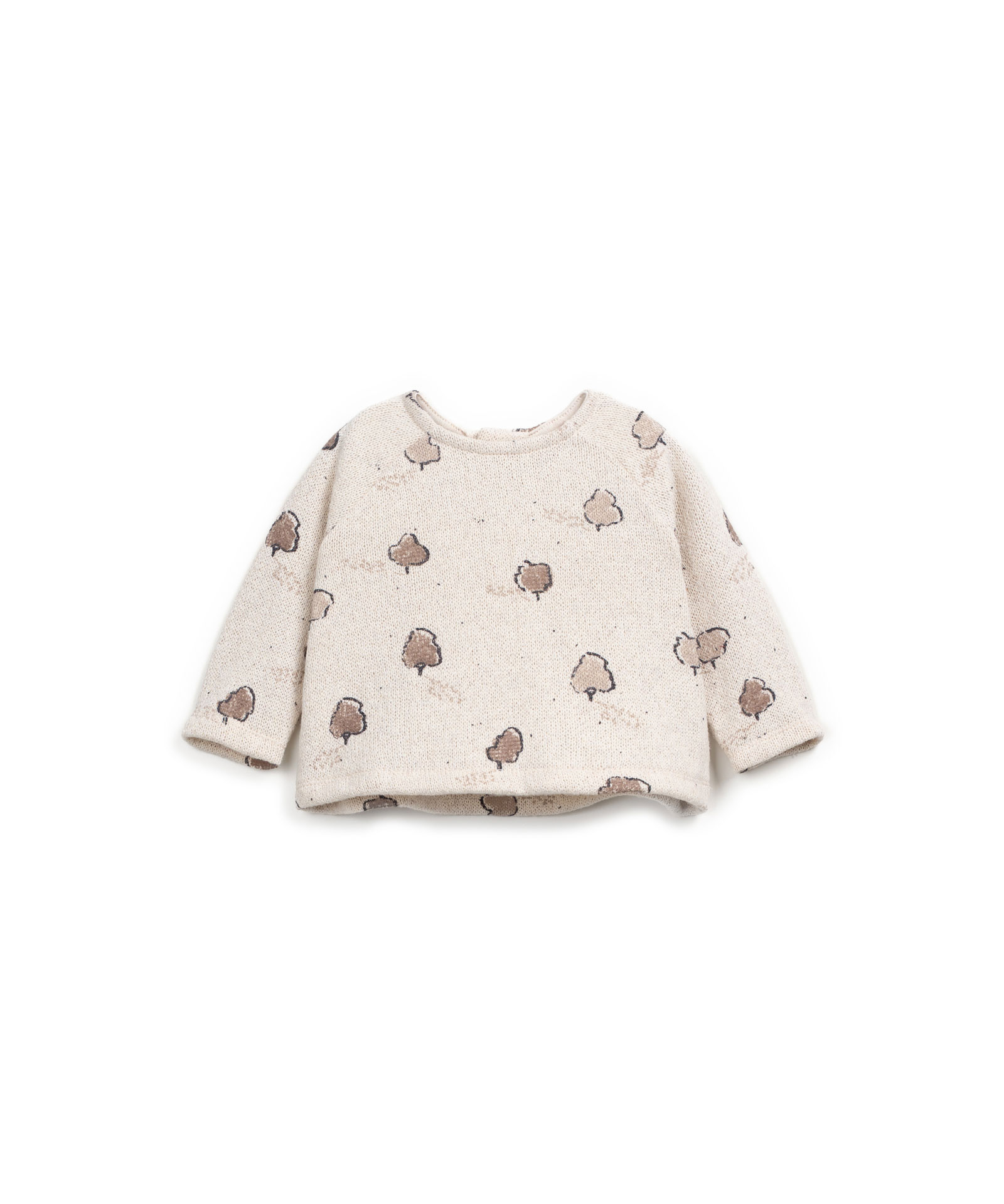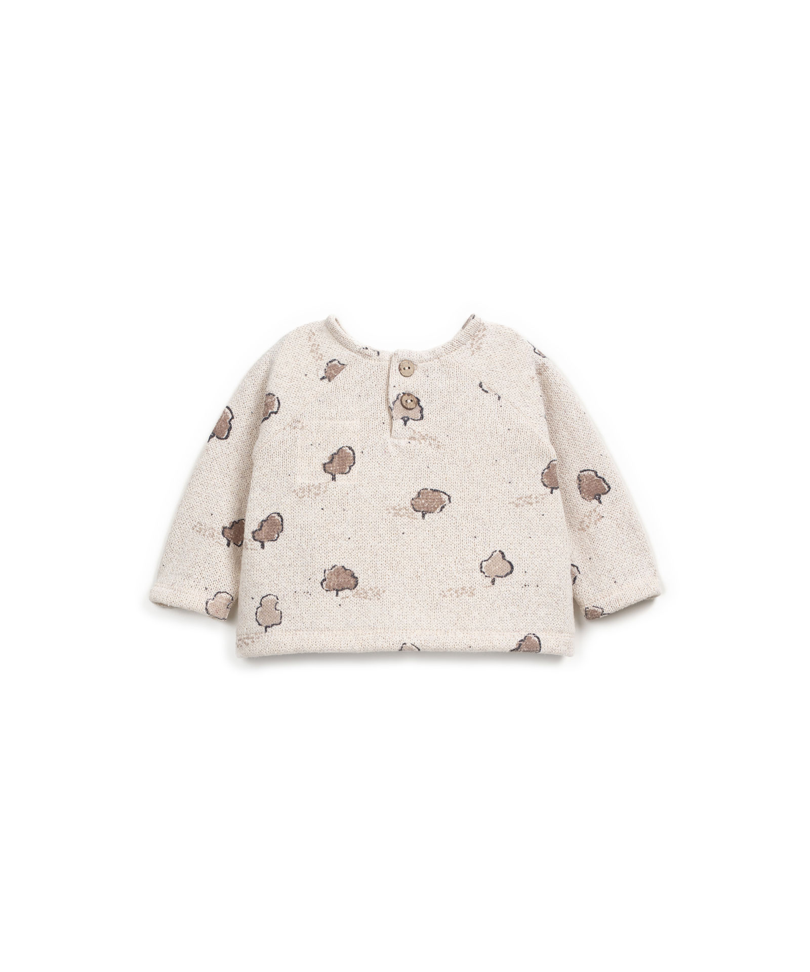 beige truitje met een all-over print van boompjes met 2 houten knoopjes aan de voorzijde. Materiaal: 90% regeneratief katoen en 10% recycled katoen.