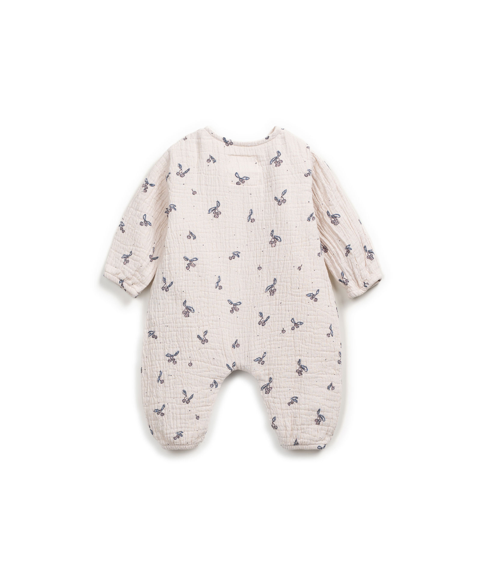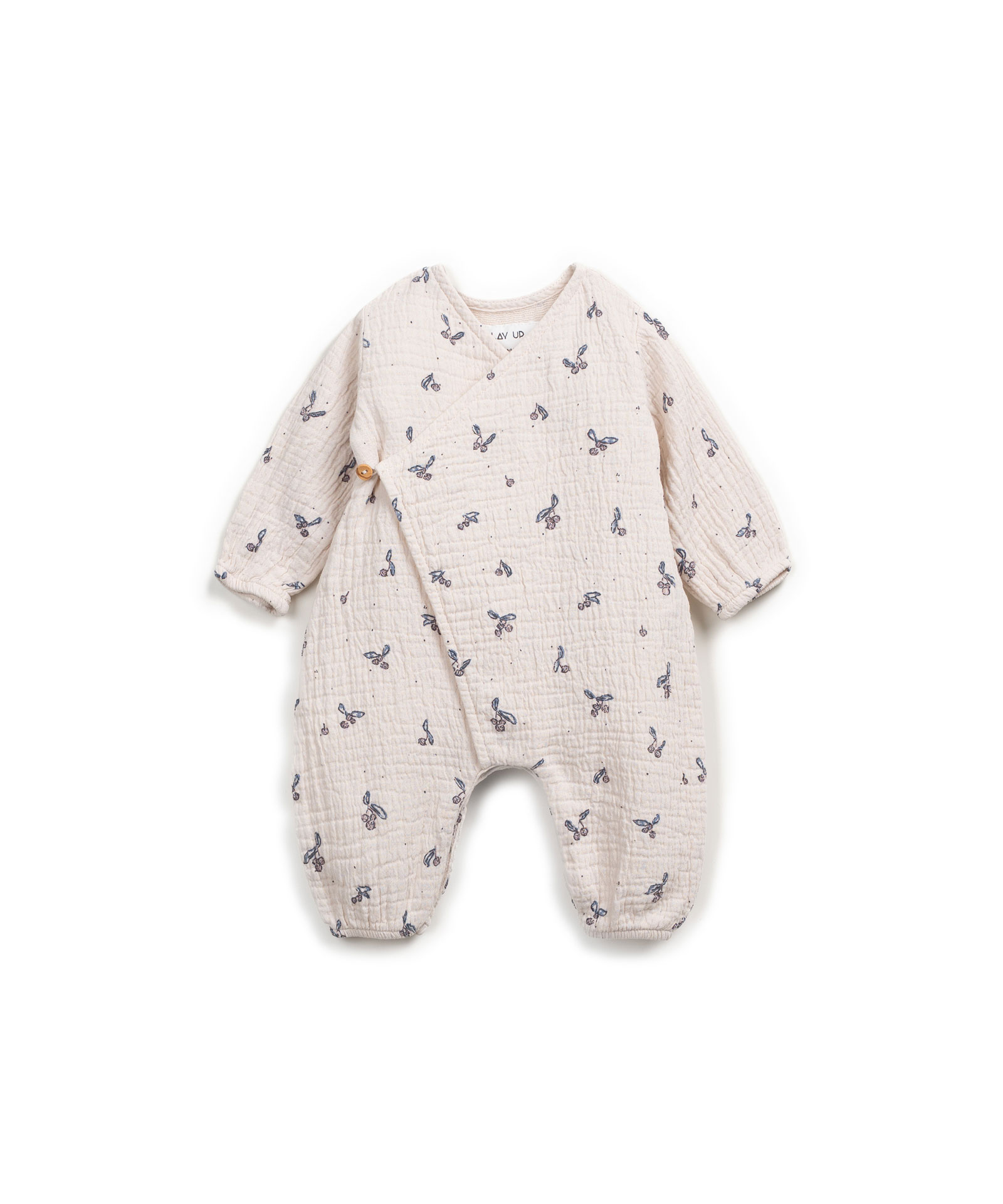 Printed woven jumpsuit van Play up is een comfortabel overslag baby pakje met elastiekjes aan de polsjes en enkels, drukknoopjes tussen de beentjes en is afgewerkt met een houten knoopje. Materiaal 100% katoen.