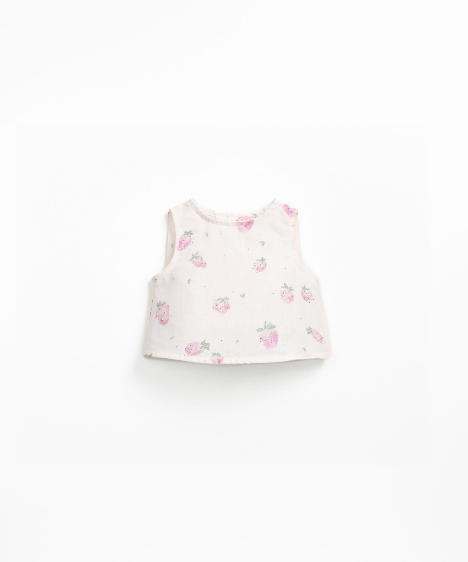 Heerlijk luchtig zomers beige topje met schattige roze aardbeitjes erop. De achterkant heeft een prachtige overslag met twee houten knoopjes. Materiaal: 52% linnen en 48% organisch katoen.