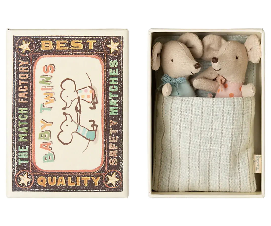 Schattige baby-tweelingmuizen slapen veilig in hun slaapzak naast elkaar, weggestopt in het luciferdoosjebed. Grootte baby muis 7,5cm. Aanbevolen leeftijd: +3 Jaar Wassen: ZACHT SPEELGOED: 30 C Materiaal: Katoen / Linnen