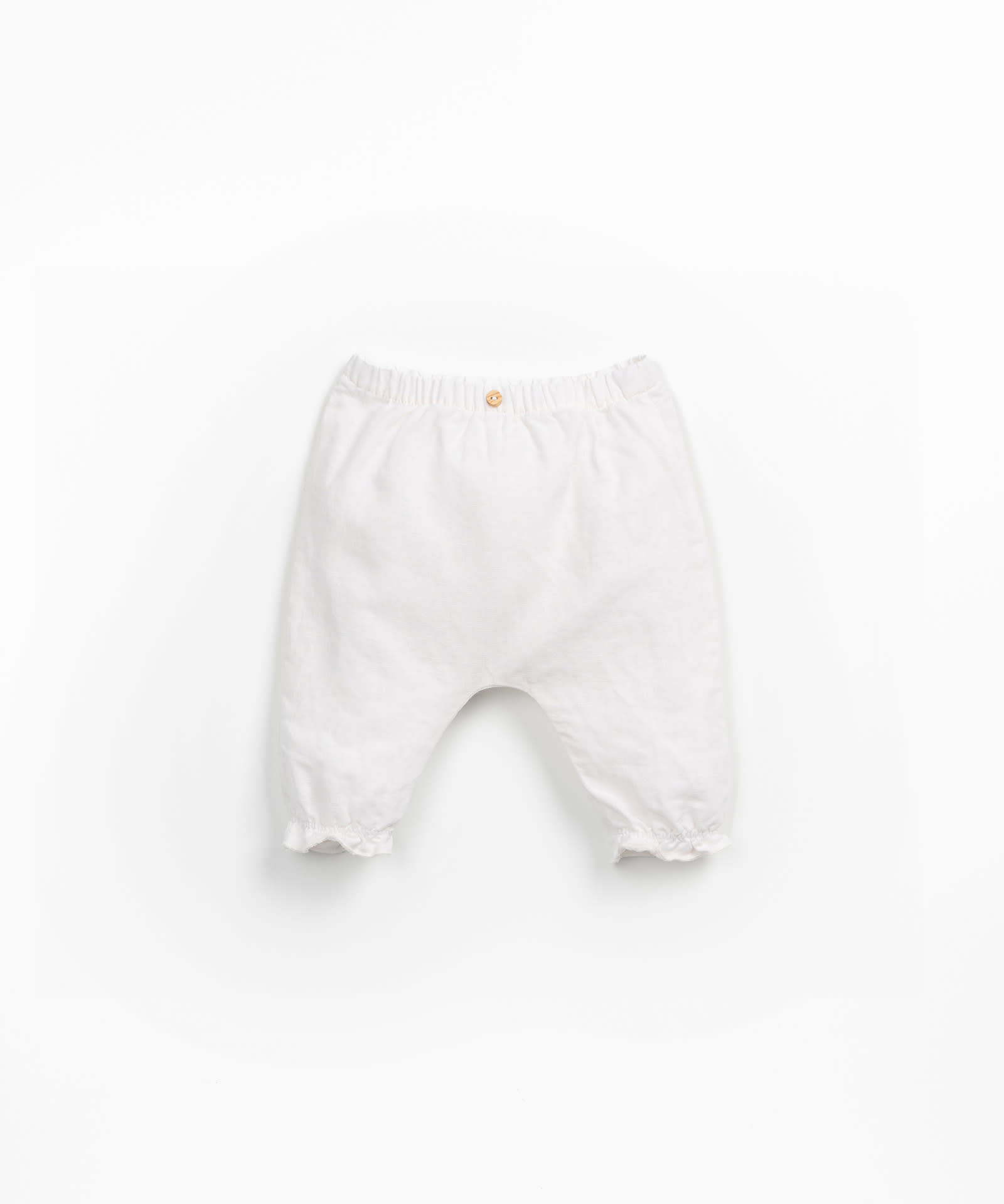 Heerlijk luchtig zomers wit broekje Woven trousers. Bij de taille en de enkels zitten elastiekjes. Materiaal: 52% linnen en 48% organisch katoen.